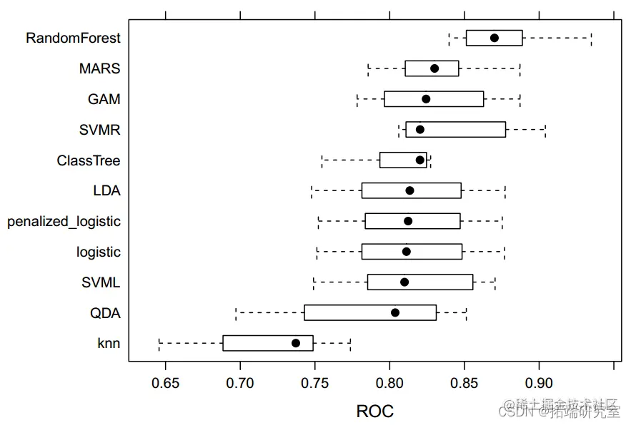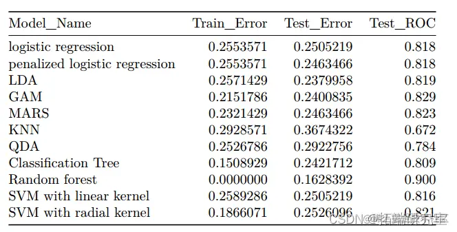 我们随机选择 70% 的观测值作为训练数据,其余的作为测试数据。所有 11 个预测变量都被纳入分析。我们使用线性方法、非线性方法、树方法和支持向量机来预测葡萄酒质量的分类。对于线性方法,我们训练(惩罚)逻辑回归模型和线性判别分析(LDA)。逻辑回归的假设包括相互独立的观察结果以及自变量和对数几率的线性关系。LDA 和 QDA 假设具有正态分布的特征,即预测变量对于“好”和“差”的葡萄酒质量都是正态分布的。对于非线性模型,我们进行了广义加性模型(GAM)、多元自适应回归样条(MARS)、KNN模型和二次判别分析(QDA)。对于树模型,我们进行了分类树和随机森林模型。还执行了具有线性和径向内核的 SVM。我们计算了模型选择的 ROC 和准确度,并调查了变量的重要性。10 折交叉验证 (CV) 用于所有模型。