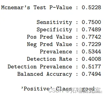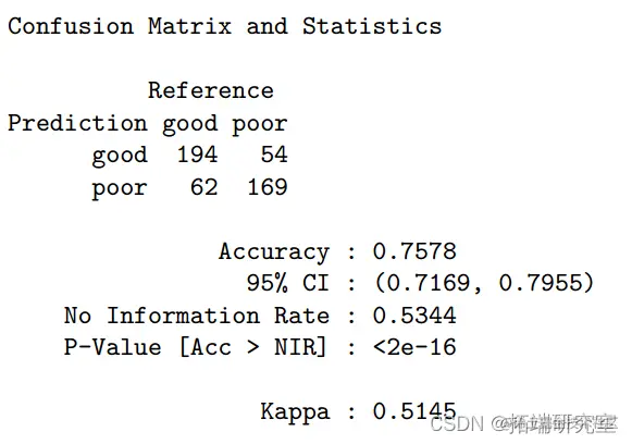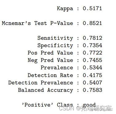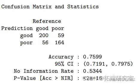 但是,由于逻辑回归要求自变量之间存在很少或没有多重共线性,因此模型可能会受到 11 个预测变量之间的共线性(如果有的话)的干扰。至于LDA,将模型应用于测试数据时,ROC为0.819,准确率为0.762(95%CI:0.72-0.80)。预测葡萄酒品质的最重要变量是酒精度、挥发性酸度和硫酸盐。与逻辑回归模型相比,LDA 在满足正常假设的情况下,在样本量较小或类别分离良好的情况下更有帮助。