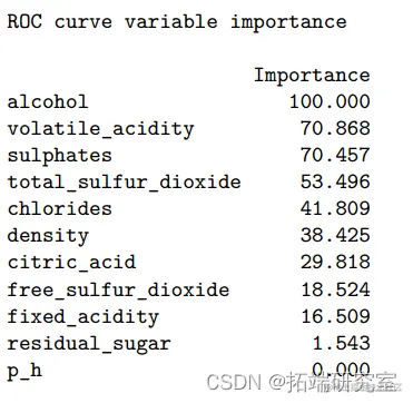 预测葡萄酒质量的最重要变量是酒精、挥发性酸度和硫酸盐。59-0.68),ROC 为 0.672。QDA模型显示ROC为0.784,准确率为0.71(95%CI:0.66-0.75)。预测葡萄酒质量的最重要变量是酒精、挥发性酸度和硫酸盐。