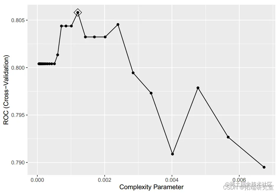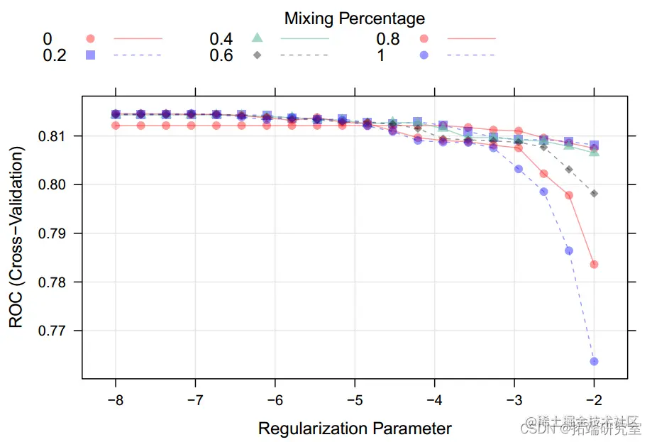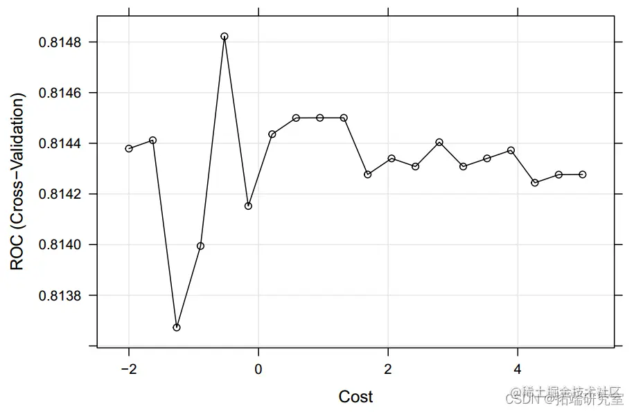 线性模型 多元逻辑回归显示,在 11 个预测因子中,挥发性酸度、柠檬酸、游离二氧化硫、总二氧化硫、硫酸盐和酒精与葡萄酒质量显着相关(P 值 < 0.05),解释了总方差的 25.1%。酒质。将该模型应用于测试数据时,准确度为 0.75(95%CI:0.71-0.79),ROC 为 0.818,表明数据拟合较好。在进行惩罚性逻辑回归时,我们发现最大化ROC时,最佳调优参数为alpha=1和lambda=0.00086,准确度为0.75(95%CI:0.71-0.79),ROC也为0.818。由于 lambda 接近于零且 ROC 与逻辑回归模型相同,因此惩罚相对较小,