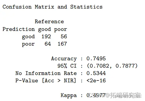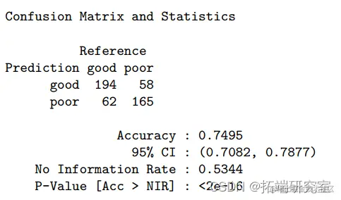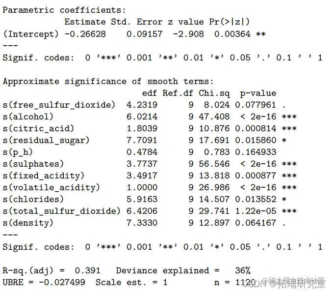 总的来说,这些变量解释了葡萄酒质量总变化的 39.1%。使用测试数据的混淆矩阵显示,GAM 的准确度为 0.76(95%CI:0.72-0.80),ROC 为 0.829。