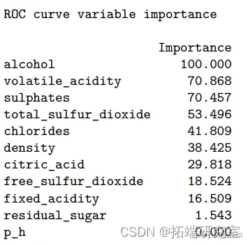 QDA模型显示ROC为0.784,准确率为0.71(95%CI:0.66-0.75)。预测葡萄酒质量的最重要变量是酒精、挥发性酸度和硫酸盐。59-0.68),ROC 为 0.672。QDA模型显示ROC为0.784,准确率为0.71(95%CI:0.66-0.75)。