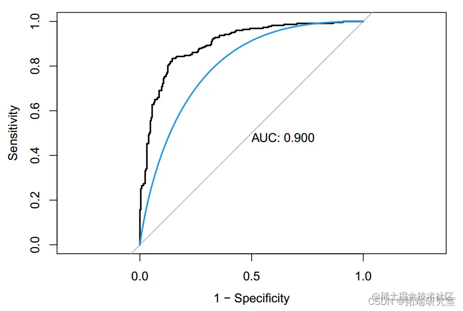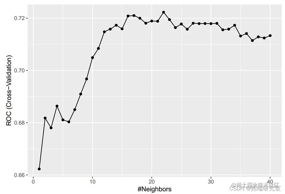 将 MARS 模型应用于测试数据时,准确度为 0.75(95%CI:0.72,0.80),ROC 为 0.823。我们还执行了 KNN 模型进行分类。当 k 等于 22 时,ROC 最大化。KNNmodel 的准确度为 0.63(95%CI:0.59-0.68),ROC 为 0.672。