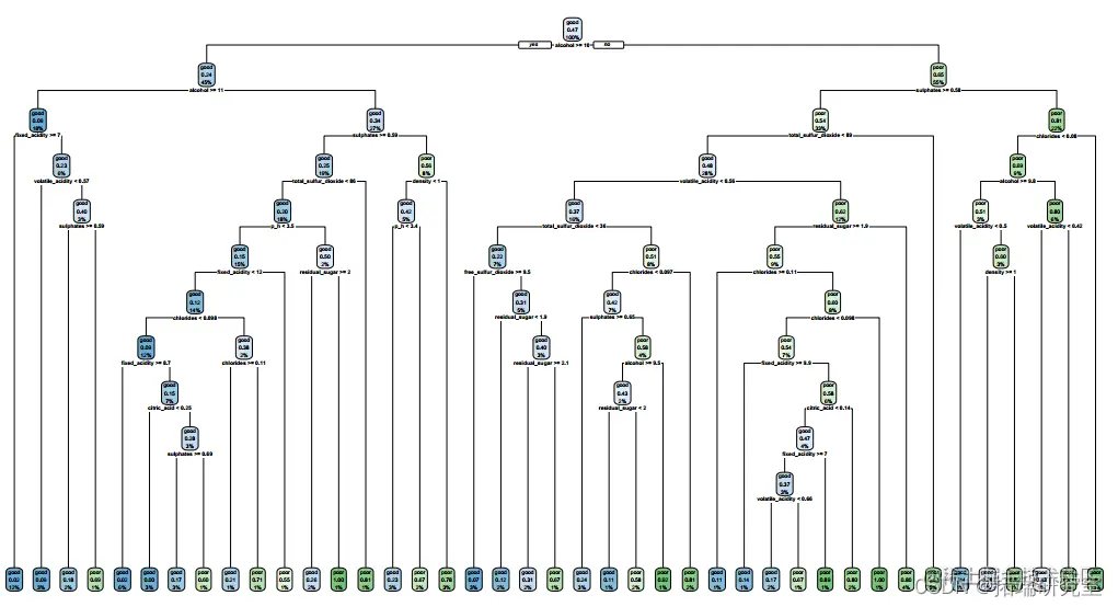 基于分类树,最大化AUC时最终的树大小为41。测试错误率为 0.24,ROC 为 0.809。此分类树的准确度为 0.76(95%CI:0.72-0.80)。我们还进行了随机森林方法来研究变量的重要性。因此,酒精是最重要的变量,其次是硫酸盐、挥发性酸度、总二氧化硫、密度、氯化物、固定酸度、柠檬酸、游离二氧化硫和残糖。pH 是最不重要的变量。对于随机森林模型,测试错误率为 0.163,准确率为 0.84(95%CI:0.80-0.87),ROC 为 0.900。树方法的一个潜在限制是它们对数据的变化很敏感,即数据的微小变化可能引起分类树的较大变化。