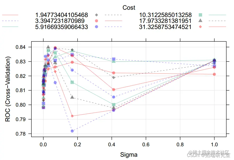我们使用带有线性核的 SVM,并调整了成本函数。我们发现具有最大化 ROChad 成本的模型 = 0.59078。该模型的 ROC 为 0.816,准确度为 0.75(测试误差为 0.25)(95%CI:0.71-0.79)。质量预测最重要的变量是酒精;挥发性酸度和总二氧化硫也是比较重要的变量。如果真实边界是非线性的,则具有径向核的 SVM 性能更好。