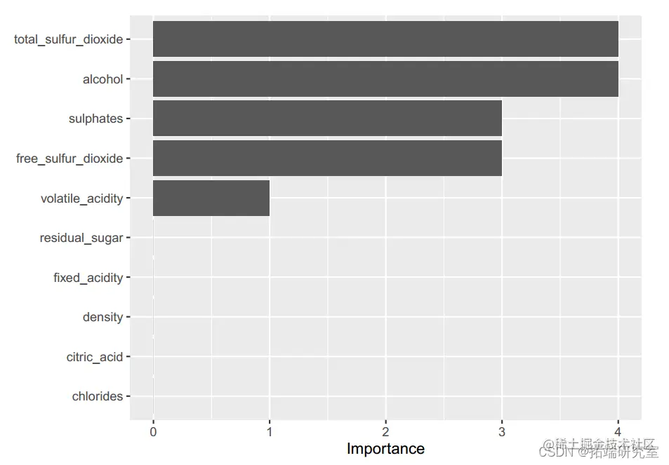 模型建立后,我们根据所有模型的训练和测试性能进行模型比较。下表显示了所有模型的交叉验证分类错误率和 ROC。结果中,随机森林模型的 AUC 值最大,而 KNN 最小。因此,我们选择随机森林模型作为我们数据的最佳预测分类模型。基于随机森林模型,酒精、硫酸盐、挥发性酸度、总二氧化硫和密度是帮助我们预测葡萄酒质量分类的前 5 个重要预测因子。由于酒精、硫酸盐和挥发性酸度等因素可能决定葡萄酒的风味和口感,所以这样的发现符合我们的预期。在查看每个模型的总结时,我们意识到KNN模型的AUC值最低,测试分类错误率最大,为0.367。其他九个模型的 AUC 值接近,约为 82%。