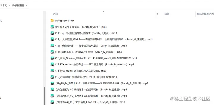 下载音频文件,保存到电脑d盘的“小宇宙播客”文件夹;注意:有些音频文件是mp3格式,有些是m4a格式