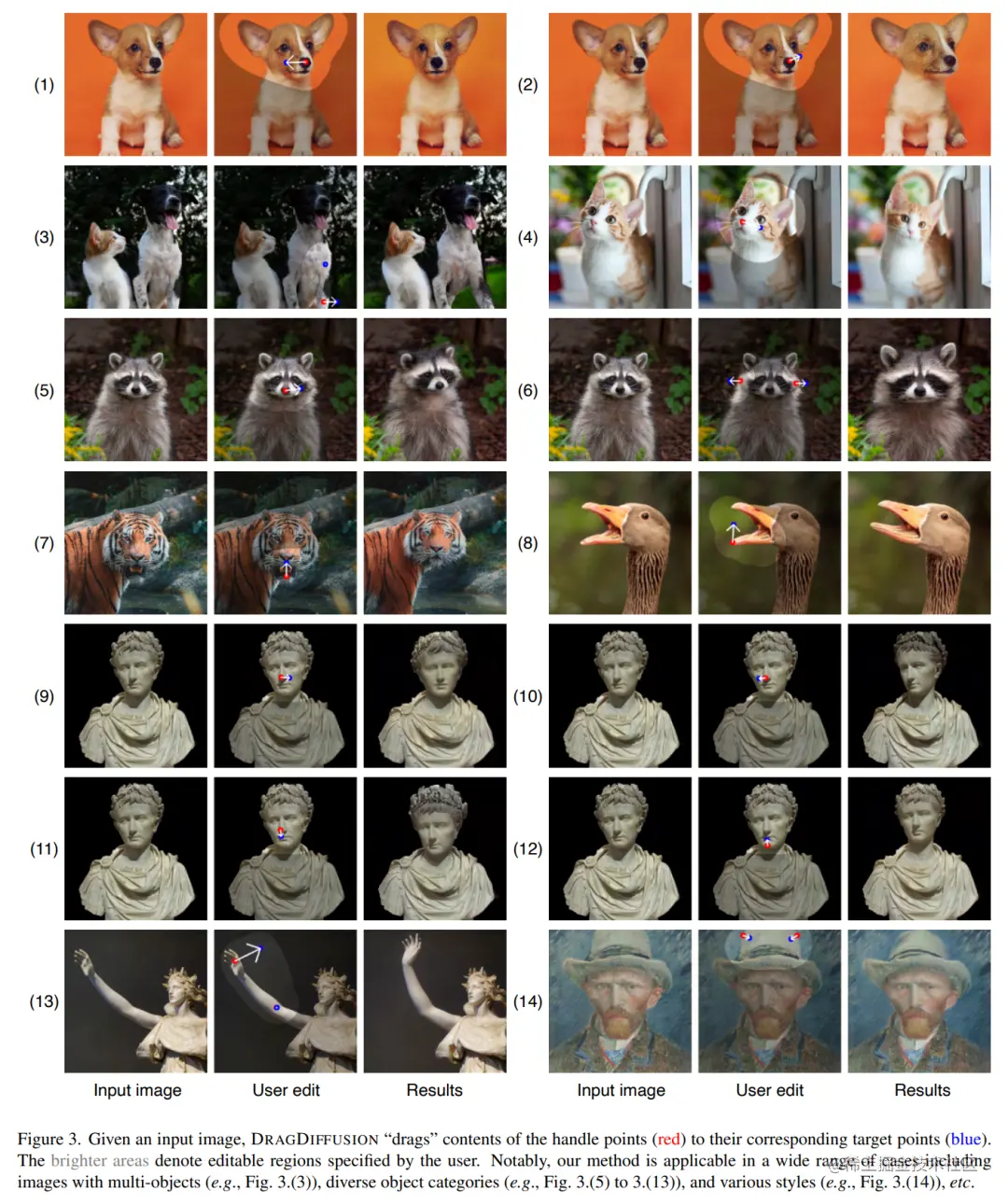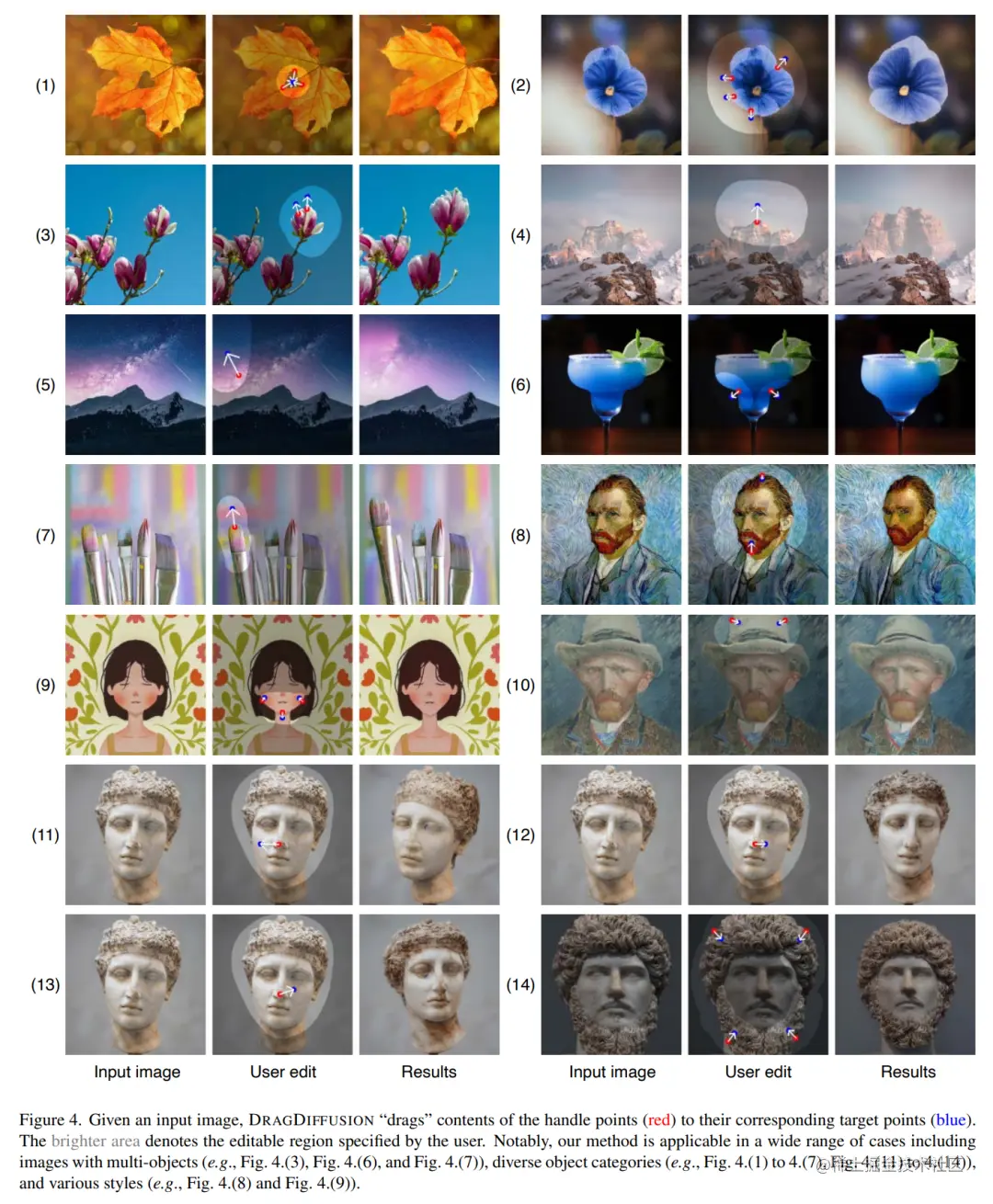 给定一张输入图像,DRAGDIFFUSION 将关键点(红色)的内容「拖拽」到相应的目标点(蓝色)。例如在图(1)中,将小狗的头转过来,图(7)将老虎的嘴巴合上等等。