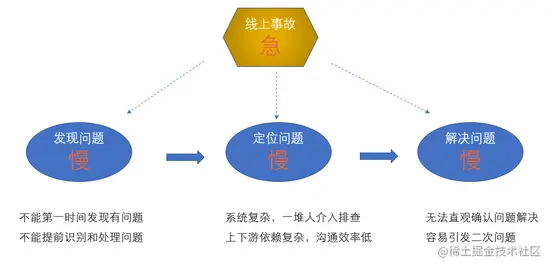 第二定位问题慢,系统庞大,大量的人需要介入排查,而且由于依赖复杂,需要反复沟通才能串起来。一方面无关的人卷入进来,人员浪费,另一方面沟通效率低,定位问题时间长。