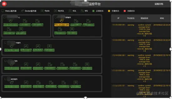 看下实际监控效果,下图是某个业务系统的实际监控效果图,左边是系统部署架构,最上面是两个前端应用,分别有自己的 Web 服务器(Docker 部署,所以只显示一个节点实例),以及 MQ 和 Redis 中间件(有多个节点实例),这两个应用同时依赖后端 3 个服务,实际节点部署情况和依赖关系一目了然。