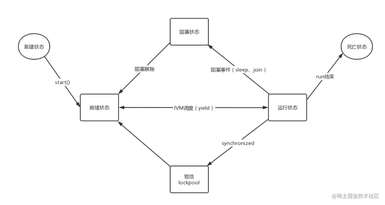 锁池:在这里找共享对象的对象锁线程进入锁池找共享对象的对象锁的时候,会释放之前占有CPU时间片,有可能找到了,有可能没找到,没找到则在锁池中等待,如果找到了会进入就绪状态继续抢夺CPU时间片。(这个进入锁池,可以理解为一种阻塞状态)