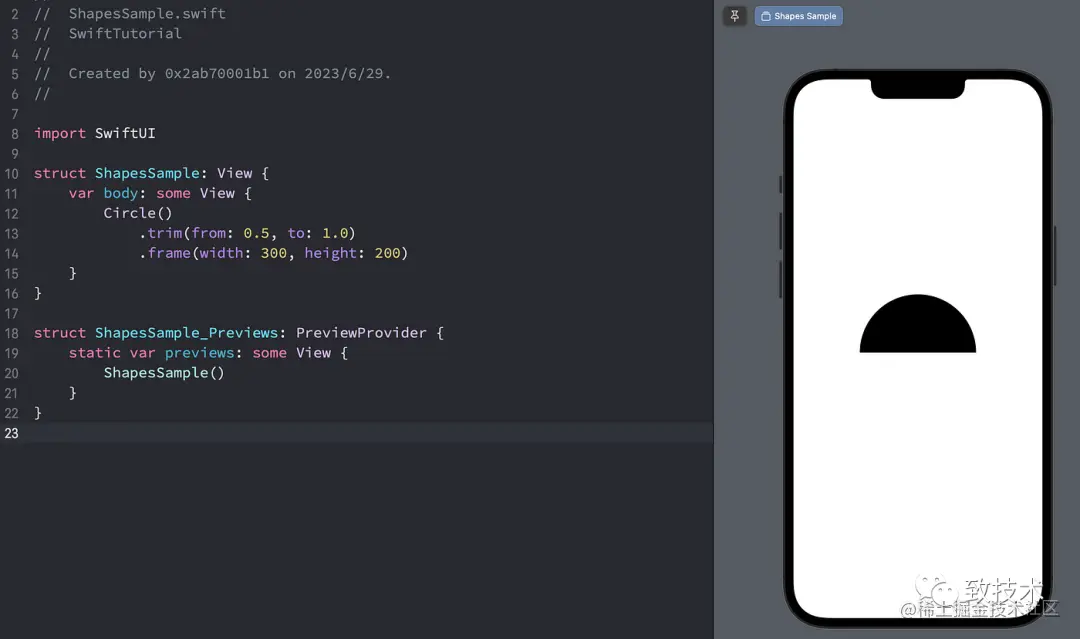 struct ShapesSample: View { var body: some View { Circle() .trim(from: 0.5, to: 1.0) .frame(width: 300, height: 200) }}