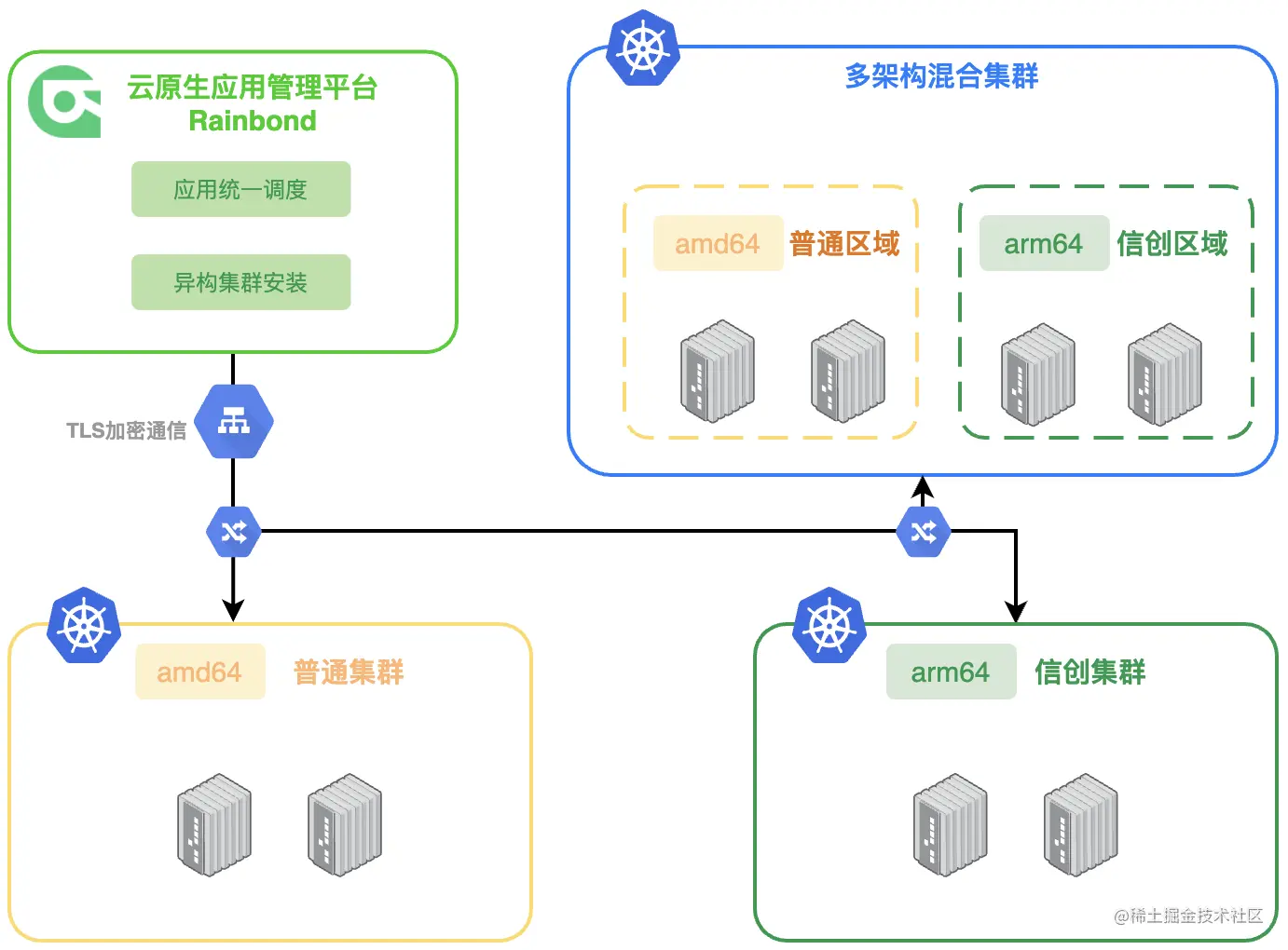Rainbond 信创版本可以在同个集群中统一管理和调度多种不同 CPU 架构计算节点,同时也可以借助多集群管理能力纳管多个单架构集群。超高的灵活性,可以让决策者自行决定异构计算资源的部署策略。