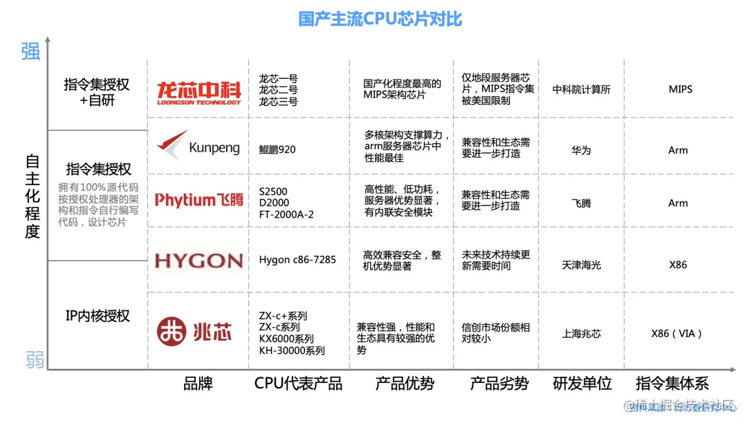 X86指令集授权,然而自主化程度最弱。X86过于成熟稳定,前人大厦已成,很难在此基础上做出创新。 - 华为、飞腾拥有