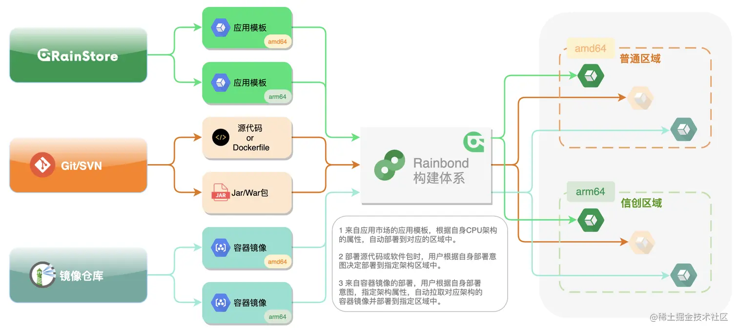 一般情况下,CPU 芯片的架构都是基于 Intel 公司推出的 X86 指令集,作为后起之秀的 AMD 也推出完全兼容 X86 的 amd64 指令集,二者可以视为等同。而在国产化信创场景中,很多国产 CPU 架构都是基于 Arm 指令集开发,常见的鲲鹏920、飞腾芯片等都属于该架构类型。为了能够融入国产化信创 IT 生态,Rainbond 自信创版本开始,全面兼容了 Arm 架构。