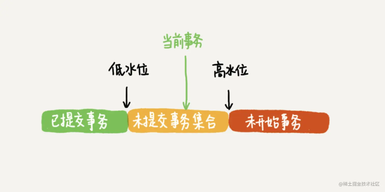 在InnoDB 中,为每个事务构造了一个 当前事务ID数组的快照,就是记录事务开启时,当前正在执行的事务ID 的集合。数组里面 trx_id 最小的记为 低水位,trx_id 最大的 + 1 记为高水位。如下图所示: