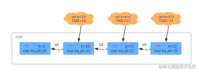 其中U3、U2、U1代表的是undo log,V1、V2、V3在物理上并不真实存在,而是在需要的时候通过V4配合undo log计算获得。