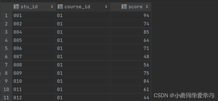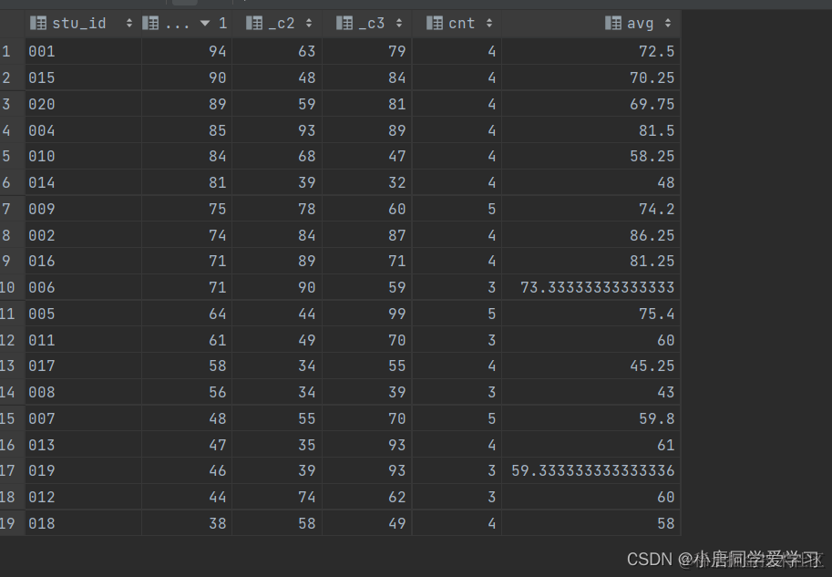 学生id 语文 数学 英语 有效课程数 有效平均成绩
