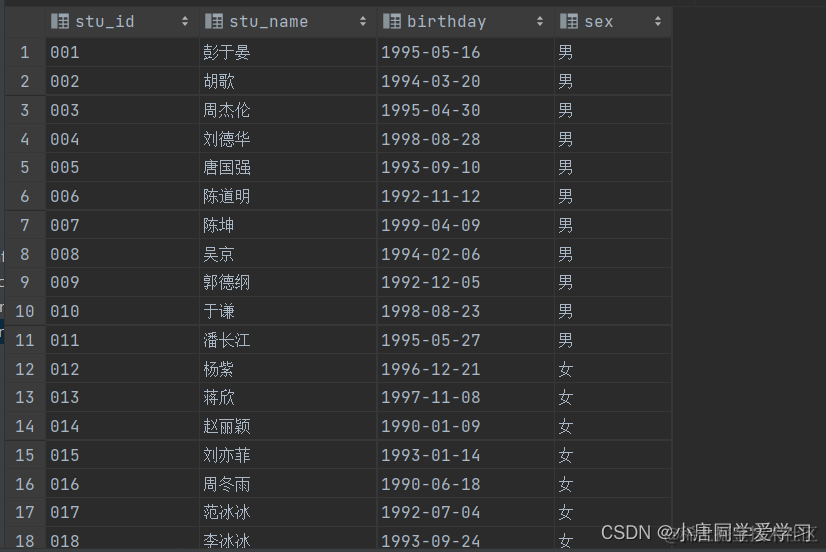 (select stu_id,stu_name,substr(stu_name,0,1) sub from student_info ) t1