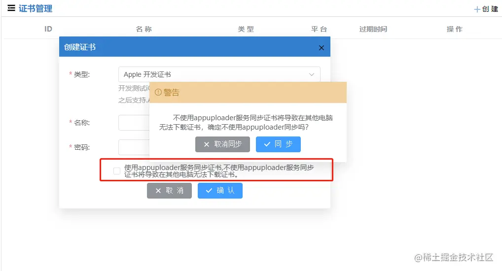 如果勾选“使用appuploader服务同步证书”此项,我们将可以在不同电脑上下