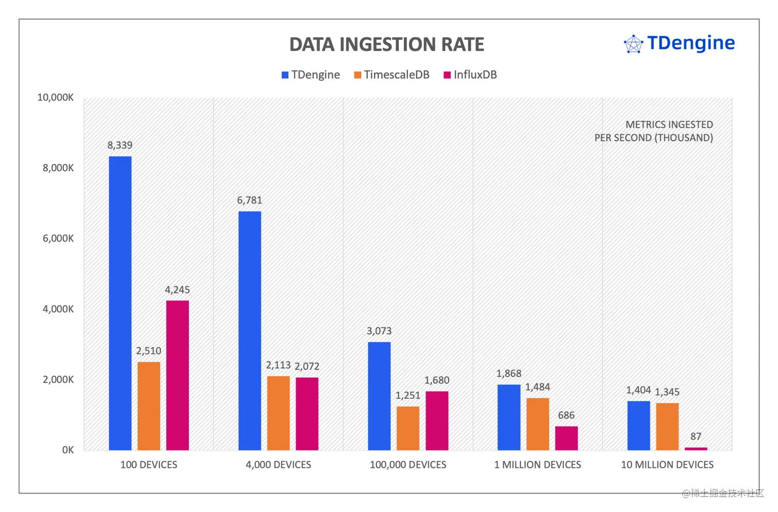 有关测试报告执行结果和重现步骤的详细信息,请参阅完整报告:《基于 TSBS 标准数据集时序数据库 TimescaleDB、InfluxDB 与 TDengine 在 IoT 场景性能对比测试》。