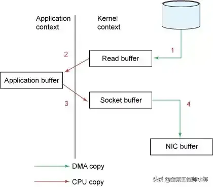 read()调用导致上下文从用户态切换到内核态。内核通过sys_read()(或等价的方法)从文件读取数据。DMA引擎执行第一次拷贝:从文件读取数据并存储到内核空间的缓冲区。