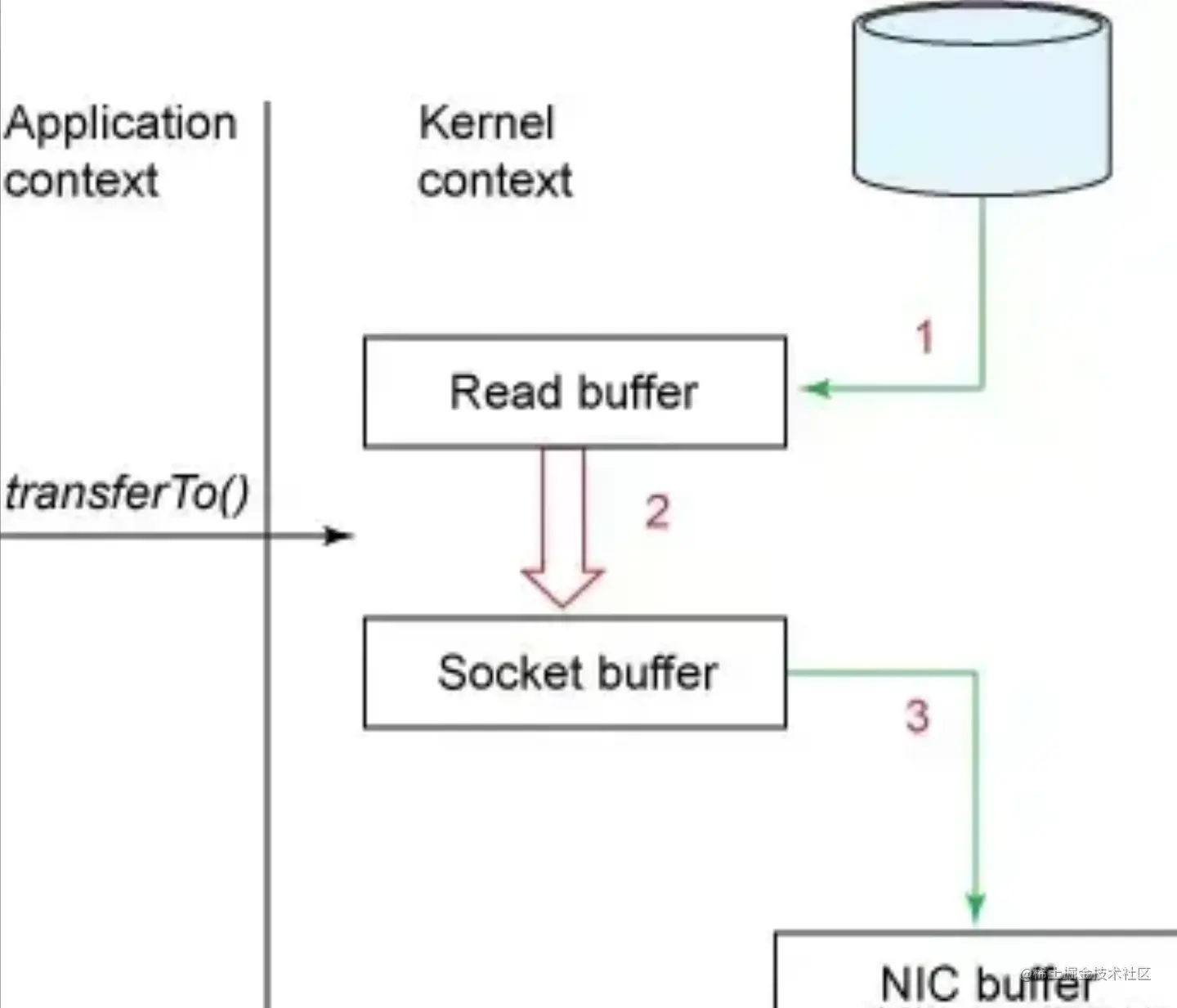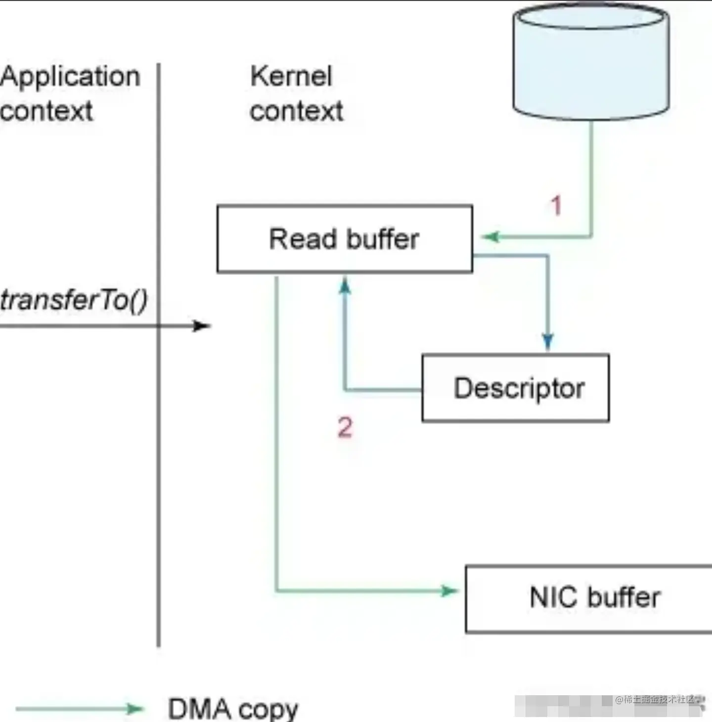 transferTo方法调用触发DMA引擎将文件上下文信息拷贝到内核读缓冲区,接着内核将数据从内核缓冲区拷贝到与套接字相关联的缓冲区。