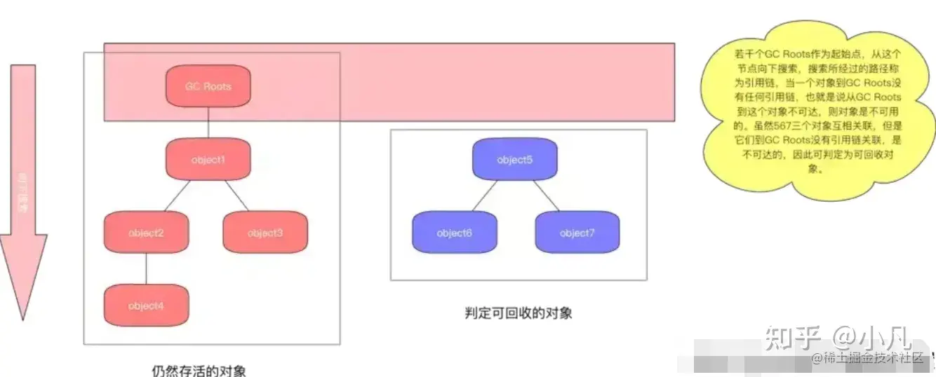 可达性分析算法是从离散数学中的图论引入的,程序把所有的引用关系看做一张图,从一个节点GC Root开始,寻找对应的引用节点,找到这个节点之后,继续寻找这个节点的引用节点,当所有的引用节点寻找完毕之后,剩余的节点则被认为是没有被引用到的节点,即无用的节点。