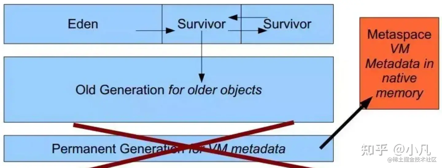永久代在JDK8中被删除,被一个叫做元空间的区域所替代了。这项改动是很有必要的,因为对永久代进行调优是很困难的。永久代中的元数据可能会随着每一次Full GC发生而进行移动。并且为永久代设置空间大小也是很难确定的,因为这其中有很多影响因素,比如类的总数,常量池的大小和方法数量等。