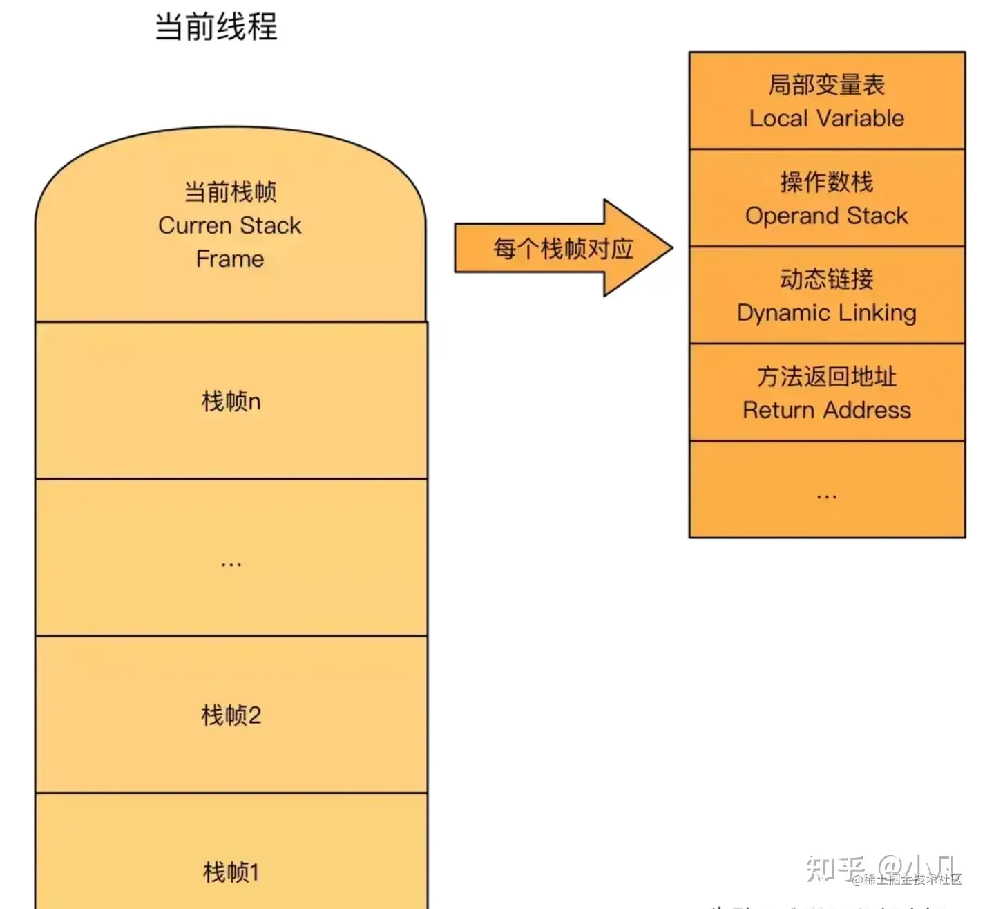 每个方法执行都会创建一个栈帧,用于存放局部变量表,操作栈,动态链接,方法出口等。每个方法从被调用,直到被执行完。对应着一个栈帧在虚拟机中从入栈到出栈的过程。