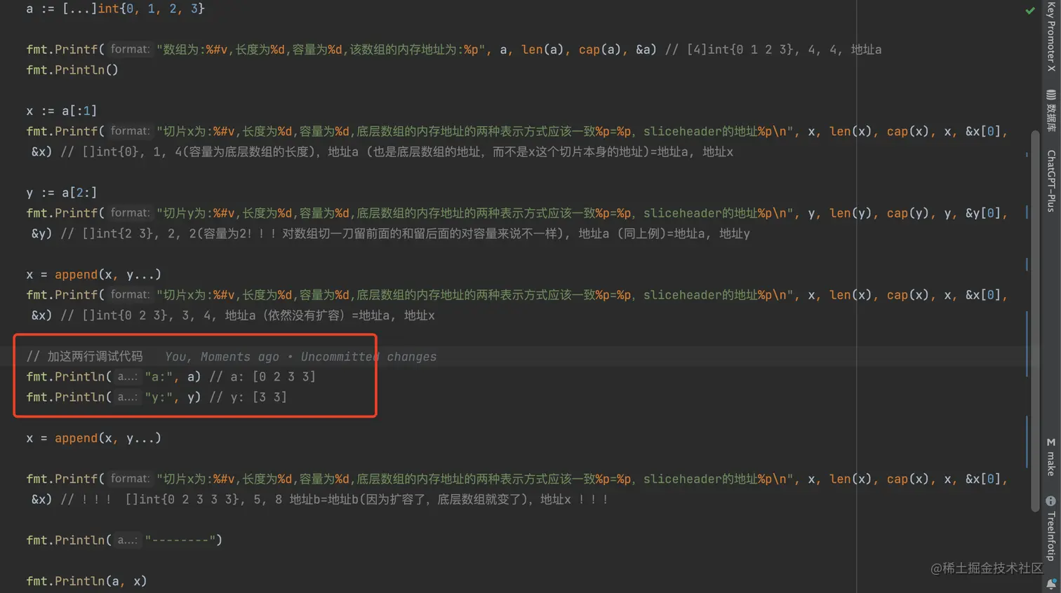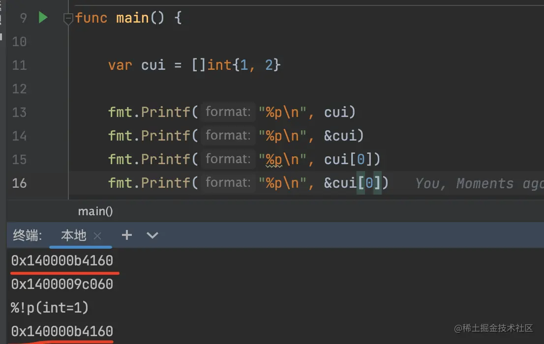 fmt.Printf("切片i为:%#v,长度为%d,容量为%d,底层数组的内存地址为%p\n", i, len(i), cap(i), i)