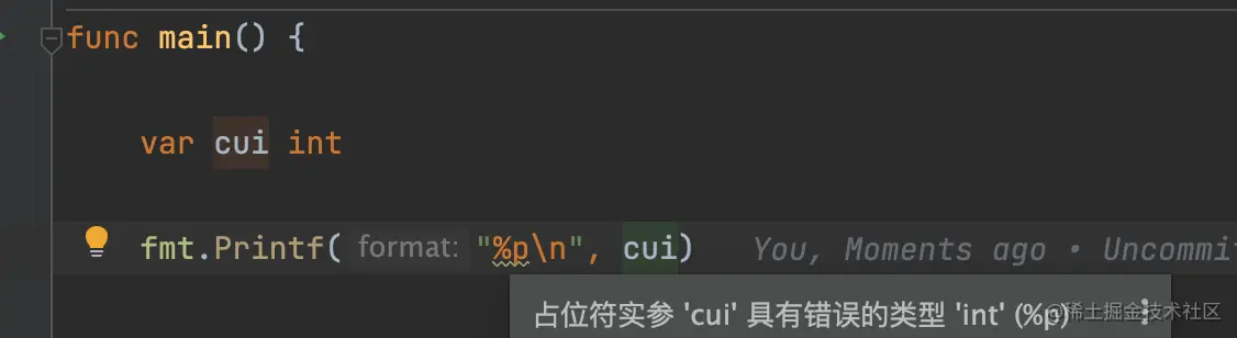 后面的参数必须为 指针类型,否则IDE会有提示,运行后打出来的是%!p(int=0)