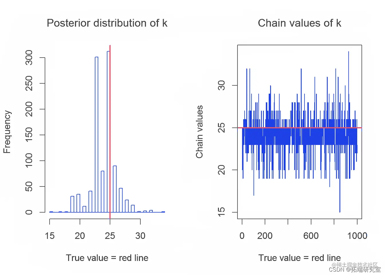 在本节中,我们将介绍 Gibbs 采样器生成的链及其参数 λ、α 和 k 的分布。参数的真实值用红线表示。