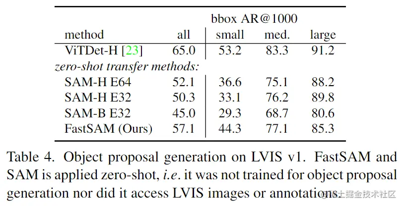 本文提出的FastSAM基于YOLACT方法的实例分割分支的目标检测器YOLOv8-seg。此外,还采用了由SAM发布的广泛SA-1B数据集,通过仅在SA-1B数据集的2%(1/50)上直接训练该CNN检测器,它实现了与SAM相当的性能,但大大降低了计算和资源需求,从而实现了实时应用。本文还将其应用于多个下游分割任务,展示了其泛化性能。在MS COCO 上的对象提议任务中,该方法在AR1000上达到了63.7,比使用32×32点提示输入的SAM高1.2点,但在单个NVIDIA RTX 3090上运行速度提高了50倍。