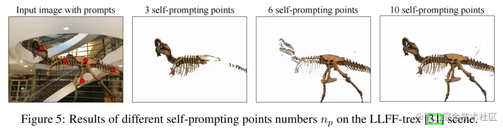 自我提示策略旨在从不完整的2D渲染掩码,中提取提示点,以帮助生成准确的2D分割结果。该策略通过选择具有最高掩码置信度分数的点作为初始提示点,并根据已有的提示点生成掩码区域。通过预训练的NeRF估计像素的深度,并将2D像素转换为3D点,以在3D空间中生成提示点。这个过程可以多次迭代执行,从而在不同的新视角下提取出多个自动生成的提示点,以获得更准确的2D分割结果。