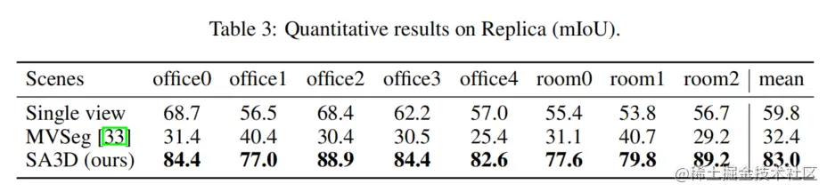 论文使用经过处理的Replica数据集来评估SA3D的分割性能。在每个对象中,论文选择一个参考视图,并使用其真值掩码进行SA3D的标签传播。在复杂的室内场景中,MVSeg的策略表现不佳,而SA3D能够准确地捕捉分割对象。