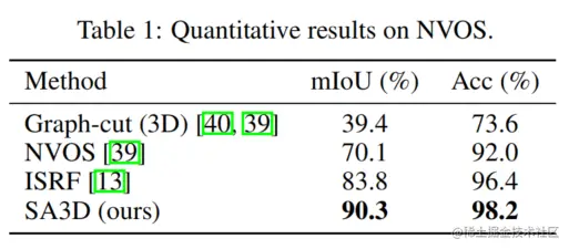 论文按照NVOS的实验设置进行了公平比较。首先,在参考视图上进行标记,然后在目标视图上渲染3D分割结果并评估准确度。实验结果表明,SA3D在性能上明显优于之前的方法,相对于最先进的ISRF提升了6.5个mIoU,并相对于NVOS提升了20.2个mIoU。