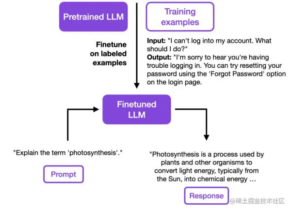 第二阶段是对这样一个基础模型进行微调。这通常包括将预训练模型训练成遵循指令或执行其他特定目标任务(例如情感分类)。ChatGPT(最初是 GPT-3 基础模型的微调版本)就是一个被微调为遵循指令的典型例子。使用本文中介绍的参数高效微调方法,可以在单个 GPU 上用 1 小时而不是 6 个 GPU 上的一天内对 LLM 进行微调。
