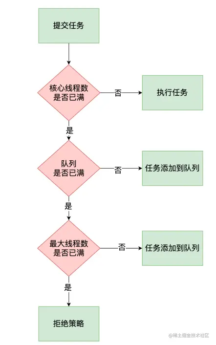 - 若线程数等于最大线程数,执行拒绝策略