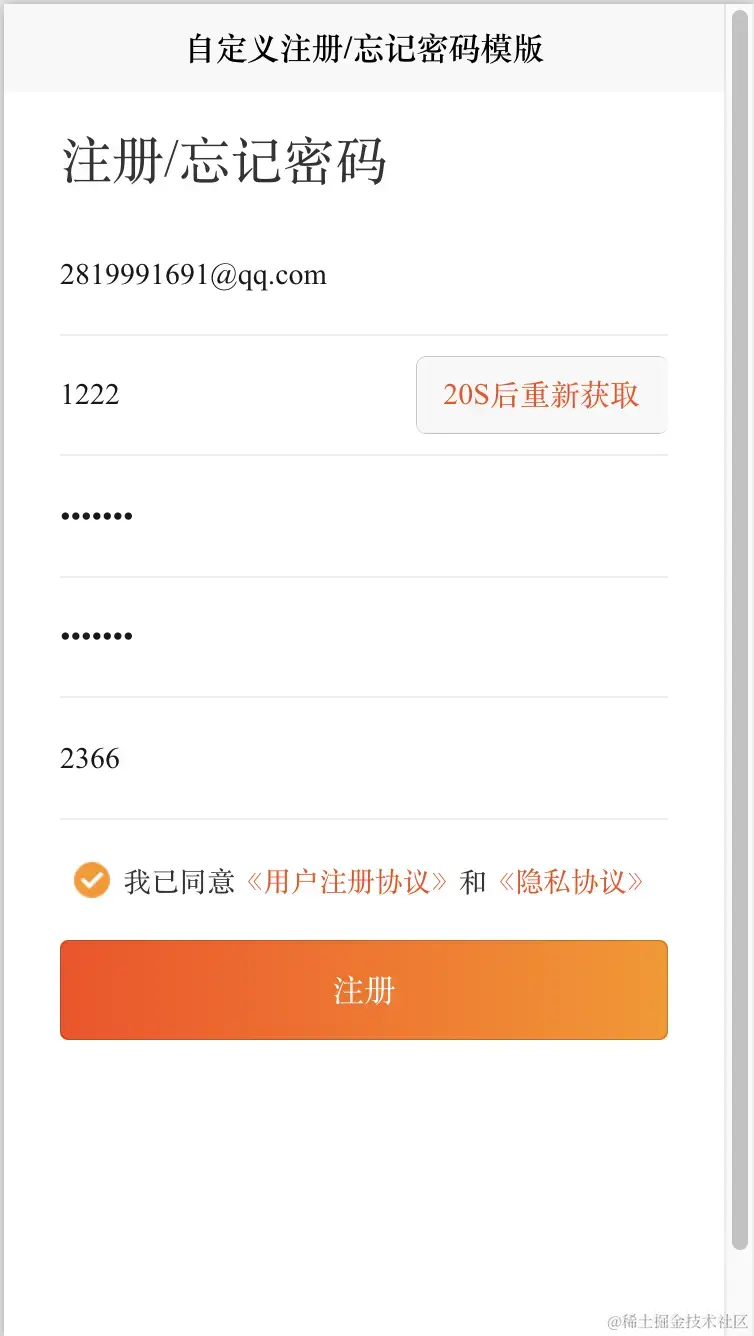 前端Vue自定义注册界面模版 手机号邮箱账号输入框 验证码输入框 包含手机号邮箱账号验证 前端组件开发 2023-07-02 1,334 阅读1分钟 前端Vue自定义注册界面模版 手机号邮箱账号输入框 验证码输入框 包含手机号邮箱账号验证 , 效果图如下: 阅读全文下载完整组件代码请关注微信公众号: 前端组件开发