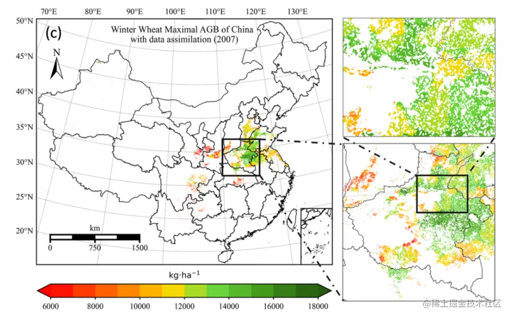 作为表征作物生长过程的关键变量,AGB在作物管理和生产中发挥着重要作用。基于过程的作物生长模型和遥感反演是作物 AGB 估算的两种重要科学方法。 2007 年至 2015 年中国主要冬小麦产区的 1 km 逐日AGB数据集。与地面实测数据相比,具有较好的一致性,R2在0.9以上,均方根误差(RMSE)达到1377 kg·ha-1。与2007-2015年县级统计数据相比,R2、RMSE和平均绝对百分比误差(MAPE)的范围分别为0.730.89、9531503 kg·ha-1和8%~12%。数据集可用于区域农业生产管理和产量估算的相关研究。