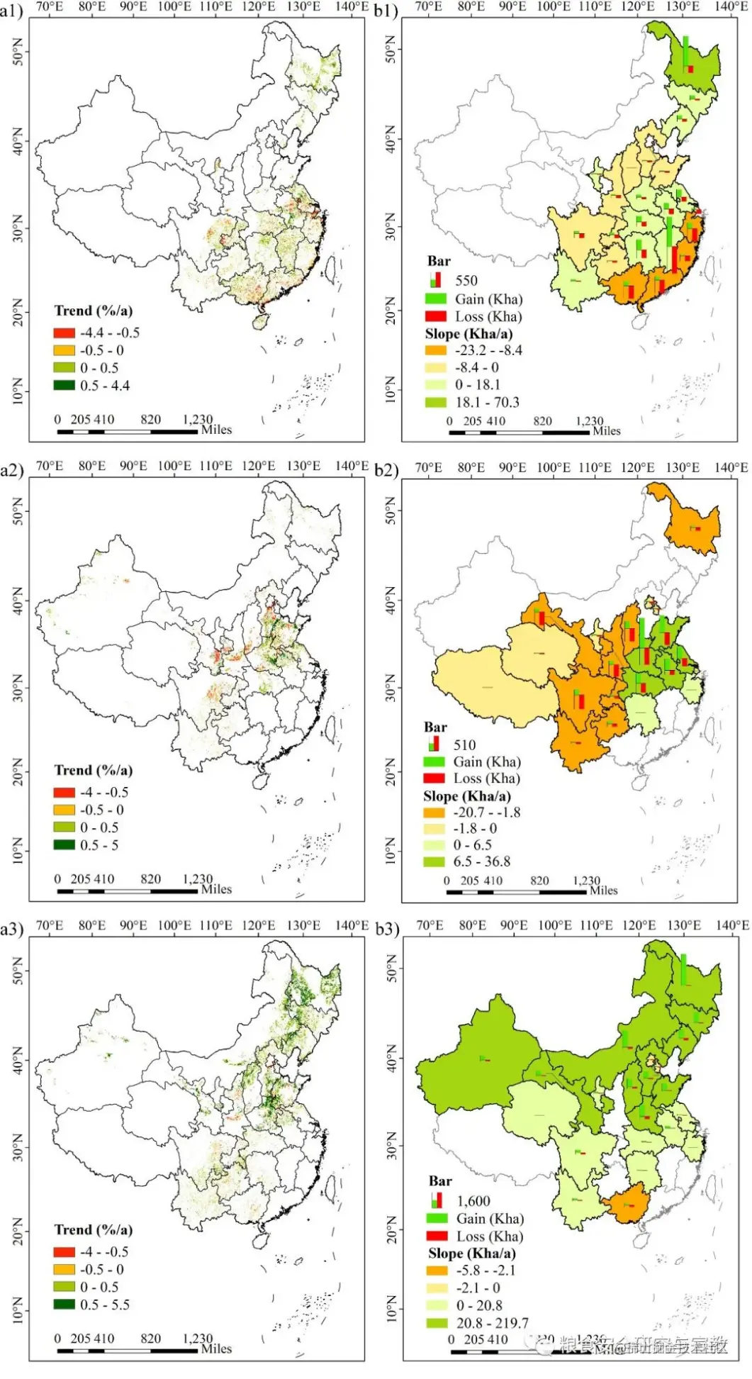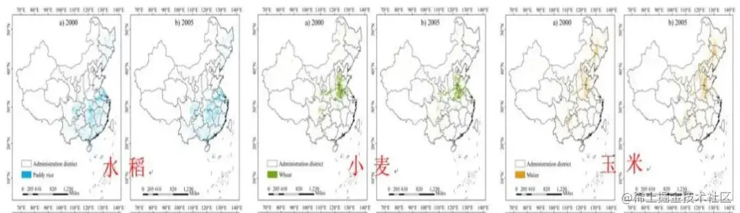水稻主要广泛分布在东北平原、长江中下游平原、四川、云贵高原梯田和珠江三角洲。小麦的分布更为集中,主要在华北平原和四川。相比于水稻和小麦,玉米的分布横跨整个中国,包括东北、华北和西南地区。