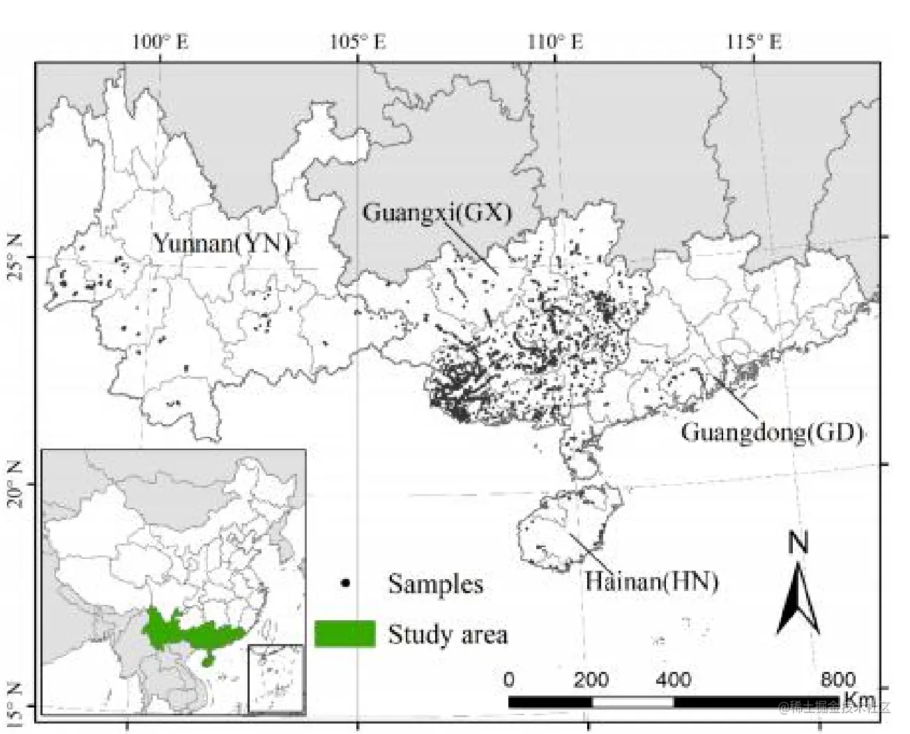 中国的甘蔗主要种植在中国南部,从秦岭北部到海南南部。如图1所示,我们在中国95%以 。上的种植区鉴定了甘蔗,包括广西(64.01%)、云南(17.70%)、广东(12.20%)和海南(1.32%)。其中广西是中国甘蔗产地,约占全国甘蔗产量的65%。在这些省份中,主要产区分布 在广西中南部、云南西南部、广东西部和海南西部。