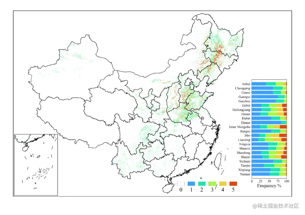 玉米是中国重要的粮食作物之一,对粮食安全有着重要影响。当前中国还没有一个全国范围的30m分辨率的玉米种植图。该研究使用基于时间权重的动态时间规划法(TWDTW),绘制了2016–2020年全国22个省份的30m分辨率玉米种植图,平均生产者精度与用户精度分别达到76.15%和81.59%。