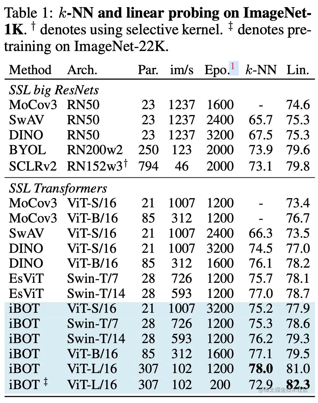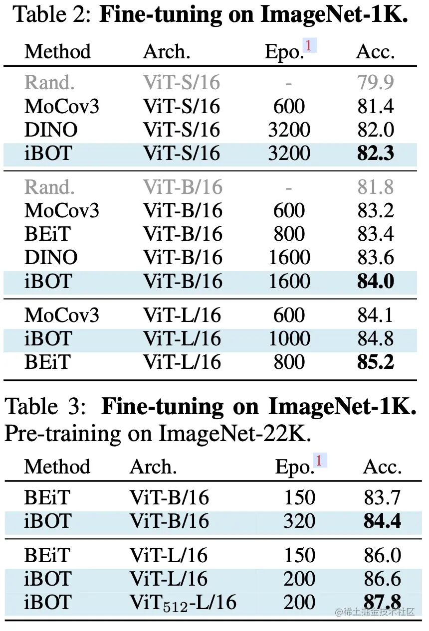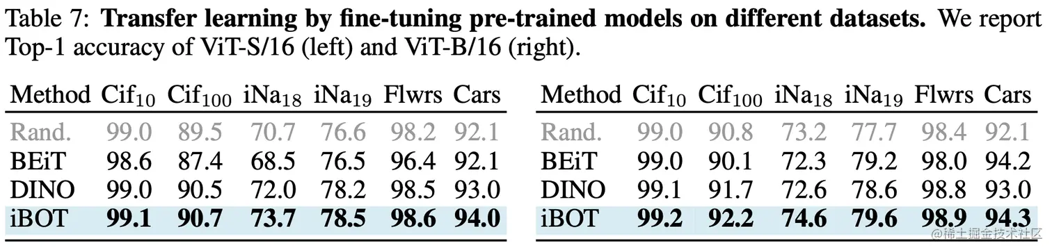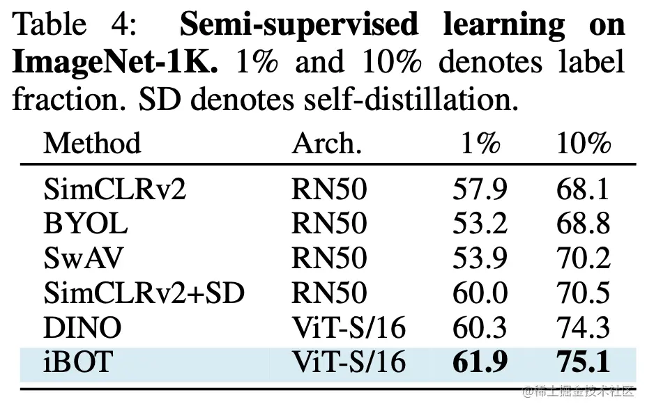 iBOT也算是对比学习的一种方法,因此比较重要的指标就是能否提取到比较好的图片表征,下面是和其他方法在imageNet分类任务上的对比,iBOT是优于DINO和其他方法的。