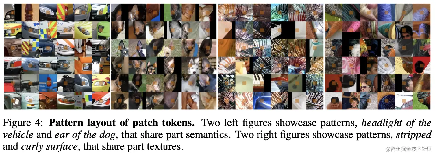和dVAE一样,展示了一些MIM所学习到的东西,作者发现iBOT对于局部语义有非常好的可视化效果,下图左边两张是车灯和狗的耳朵,聚类出的图片也基本属于这两个类别;右边两张展示的则是局部的纹理,聚类出的图片也是非常相似的。