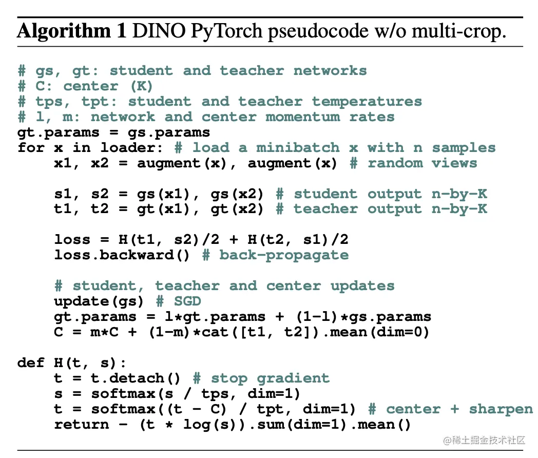 DINO的伪代码如下图所示: