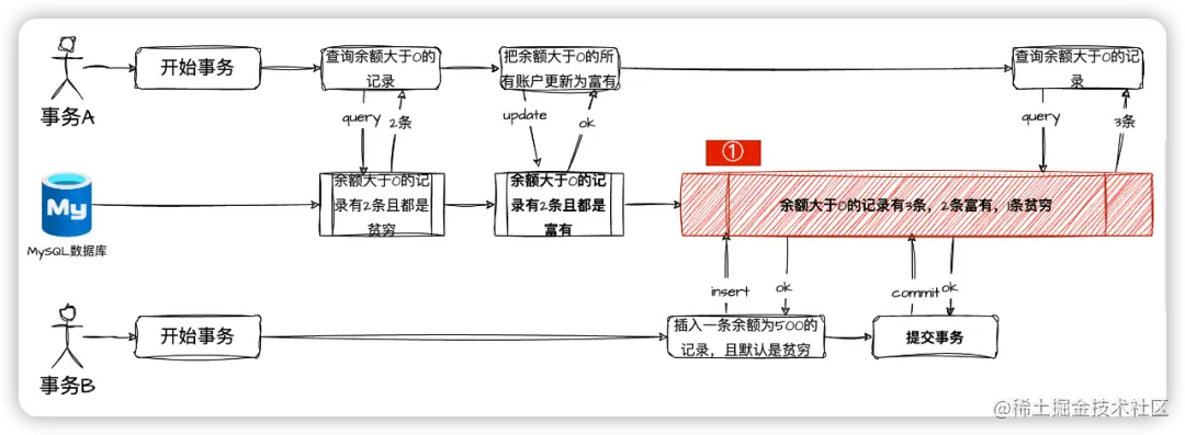 在这之后,如果事务A再发起相同条件的查询,会发现刚刚的更改对于某些数据未起作用(有些记录未被标识为富有),而且数据行比原来还多了!