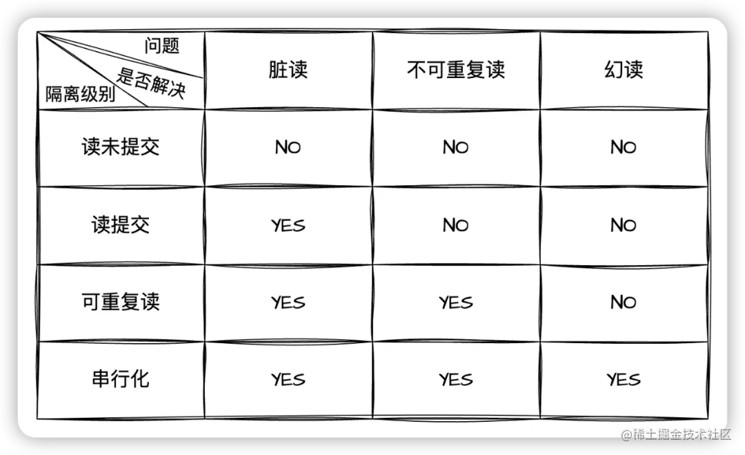 只有串行化的隔离级别解决了全部这 3 个问题,其他的 3 个隔离级别都有一定的缺陷。