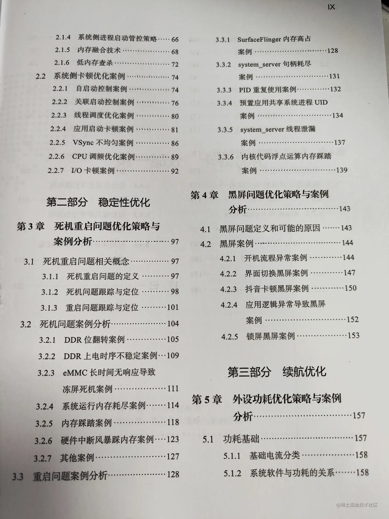 - 系统优化方面,首先介绍了系统优化的各种策略,然后分析了系统侧卡顿的7个较为典型的案例。
